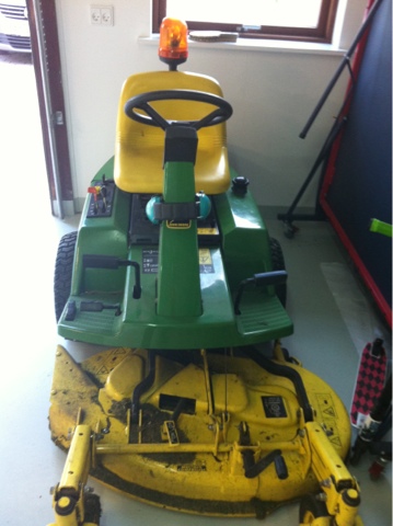 Men nu er det så i garagen hvor han har sit domæne at det har taget fuldstændigt overhånd. Alt er spraymalet gul og grøn. Her er lige lidt billeder af hans kære værksted/garage. Og som detalje vil jeg bare lige fortælle at det tog ham 2 uger at lave det store logo over sit værkstedsbord hvor der er gule og grønne dioder rundt i logoet. Og så tog det ham også 2 uger at sætte en 'radio' ind i en af skabslågerne. Forstår virkelig ikke det der John Deere-gen.